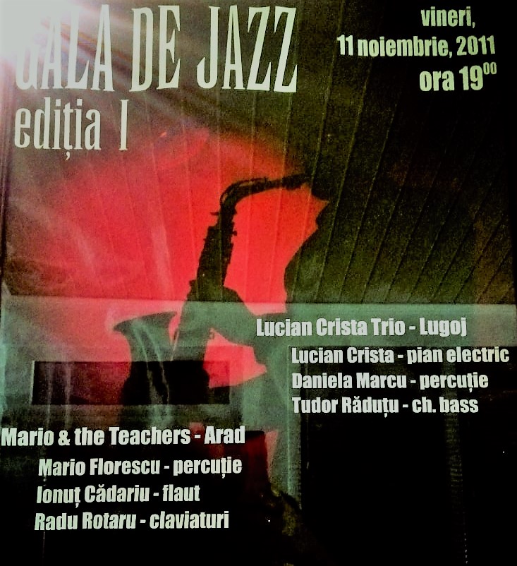 Mi-a plăcut mult concertul, mi-au plăcut mult muzicienii arădeni și, astfel, având deja două trupe, una din Arad și alta din Lugoj, care nu implicau financiar foarte mulți bani, m-am gândit că s-ar putea organiza o Gală de Jazz. E adevărat, aveam un Festival de Blues, la Lugoj, dar blues-ul îi blues și jazz-ul îi jazz… Chiar dacă nu ar fi implicat mulți bani organizarea acelei Gale, totuși, erau bani de care nu dispuneam. Bugetul pe anul 2011 era deja făcut și nimeni nu mi-ar mai fi dat alți bani, la o eventuală rectificare. Era, totuși, vorba de jazz și orașul era Lugoj, până la urma urmei… Mi-am amintit de banii pe care i-am obținut din vânzarea biletelor, de la prima ediție a Festivalului de Blues, în 2009. Au fost vreo 3000 de lei. Banii respectivi au fost folosiți de Ansamblul Folcloric „Lugojana”, pentru plata transportului unei deplasări la un festival. Mi-am luat inima în dinți (bine, nu era chiar așa, discuțiile cu fostul director al Casei de Cultură a Municipiului, prof. Nicolae Blidaru, erau chiar o plăcere 😊) și am discutat cu directorul Casei de Cultură a Municipiului posibilitatea de a folosi banii din bilete, pentru a organiza această Gală. A fost de acord. La ediția din acel an, din 2011, s-au strans cam 2000 de lei și, așa, cu un buget de aproximativ 500 de euro, cu sonorizarea celor de Mario and the Teachers, cu bunăvoința colegilor de la Casa de Cultură a Municipiului (cu sediul la Teatru!), în 11 noiembrie 2011 a avut loc PRIMA Gală de Jazz de la Lugoj.