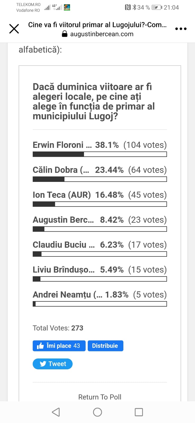 Referitor la „protagoniștii” acestui sondaj, NICIUNUL dintre cei pe care i-am nominalizat nu și-au exprimat oficial intenția de a candida la „fotoliul” primăriei. Au fost doar supozițiile mele. Mai sunt peste 2 ani până la alegeri, așa că se pot întâmpla multe. Așa cum am spus când am postat sondajul, rezultatul lui „poate fi un început pentru o viitoare discuție despre un viitor primar”. Și acum să povestim puțin pe tema rezultatului. Nu mă miră deloc clasarea lui Erwin Floroni pe primul loc. E nou în politică, deci nu a avut timp să intre în scandaluri, și are o imagine bună. Am observat că aproape orice poză pe care o postează pe pagina personală de facebook primește peste 1000 de like-uri, așa că cele doar 100 de voturi din acest sondaj mi se par mai mult decât corecte. El nu beneficiază de un partid prea „numeros” în spate, care să-l susțină la vot, dar e foarte cunoscut, mai ales datorită meseriei pe care o practică. Călin Dobra, pe locul doi în acest sondaj (în ultimul, cel din a treia zi, se află pe primul, dar, așa cum am spus, au fost vreo 60 de voturi în 3 ore, ceea ce mie mi-a „sunat” a mobilizare generală…). Este un loc pe care îl preconizam, deoarece este o persoană cunoscută, are „ceva” ani buni de politică în spate și o experiență de 3 ani, ca Președinte al Consiliului Județean Timiș. Reprezintă un partid bine structurat, activ, care se situează foarte bine în sondaje și care cu siguranță va avea un cuvânt greu de spus în cazul unei mobilizări pentru alegeri. Poate, la nivel de Lugoj, ultimul sondaj, cel în care Călin Dobra este pe primul loc, să fie cel real, nu contest acest fapt, dar aici, pe acest site, sigur este sondajul pe care l-am prezentat eu… Ion Teca, locul 3. În acest sondaj, l-am trecut din proprie inițiativă pe listă, deoarece mi s-a părut cel mai cunoscut dintre membrii AUR lugojeni. Are și un scurt istoric politic, deoarece a participat la ultimele alegeri locale, dar, la acea dată, reprezentând un partid foarte mic. Acum, cu sprijinul unui partid mult mai mare, șansele i-au crescut exponențial. Augustin Bercean -adică eu, locul 4, marea surpriză! 😂. Așa cum am spus, grupul țintă al acestui sondaj îl reprezintă cititorii siteului http://www.augustinbercean.com. Era normal să mă bucur de o anumită popularitate și să iau un „binemeritat” loc fruntaș. Sunt conștient că, în condițiile unui sondaj efectuat la nivel de Lugoj, e foarte clar că nu mai „văd” eu o asmenea clasare, dar… Locul 5, Claudiu Buciu. Pentru unii, surpriză, pentru mine, sincer, nu. Ca primar, e normal să își fi erodat imaginea în ultimul an și jumătate. Ca partid, liberalii nu preau au rupt gura târgului, în istoria politică a Lugojului, exceptând ultimele alegeri locale, în care au fost un caz izolat. PNL-ul lugojean mereu a fost al treilea sau la patrulea partid ca importanță în Lugoj. Ca imagine proprie (cu toată presa locală de partea lui, într-un mod „necondiționat”=, actualul primar are toate „pârghiile” să se redreseze în următorii 2 ani. Ca partid, nu cred că mai poate face ceva… Pe Liviu Brîndușoni, locul 6, l-am pus pe listă deoarece, la un moment dat, pe când era președintele USR Lugoj, era creditat cu mai multe șanse la câștigarea fotoliului de primar, la Lugoj, decât Claudiu Buciu. Chiar dacă politic nu a mai auzit nimeni de el, de peste un an, aceste voturi arată că încă există în memoria colectivă. Andrei Neamțu, locul 7, a fost cel mai bine clasat dintre independenții de la alegerile trecute. Nu știu dacă intenționează să mai candideze. Și el a dispărut din viața politică lugojeană, dar mi-am zis că „poate, cine știe?”. Sunt convins că, chiar dacă foarte criticat, acest rezultat al sondajului este binevenit pentru toată lumea. El poate reprezenta un punct de plecare, măcar, pentru o discuție. Este timp sufiecient pentru toată lumea să se pregătească pentru alegerile viitoare. Mulțumesc cititorilor site-ului http://www.augustinbercean.com pentru participarea la vot și îi rog pe cei care viciază, într-o fel sau altul, rezultatul, să nu o mai facă. Un rezultat viciat e rău pentru toată lumea, chiar dacă, teoretic, unii vor avea „bucuria” falsă a primului loc. O zi bună vă doresc!