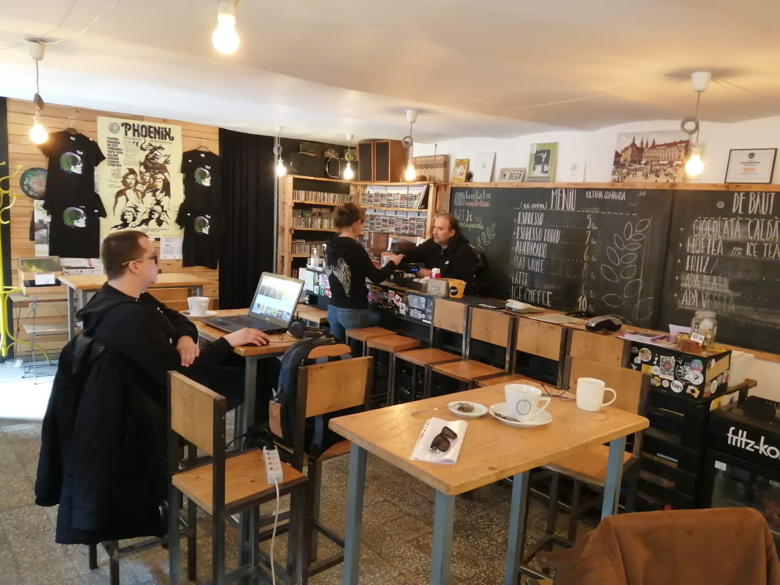 Când m-am hotărât să mă întorc, în 2014, mi-am zis că o fac doar dacă fac ce-mi place. Într-o zi mă plimbam cu bicicleta pe strazile astea și am văzut într-un geam un anunț de închiriere. Înainte aici a fost Sakura, un „birt” legendar în Timișoara, unde s-a mai și cântat live. Mi-am zis că, na, nu plec de la zero. Am vorbit cu proprietarul, care era în Anglia, care a fost de acord să mi-l închirieze. Aveam de gând să fac doar cafenea cu viniluri, că mă gândeam că voi face bani mai mult din cafea.