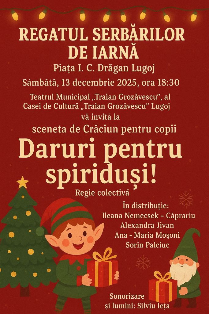 Sâmbătă, 13 decembrie 2025, de la ora 18:30, în Piața I.C. Drăgan, copiii sunt invitați să pășească în atmosfera magică a sărbătorilor prin sceneta „Daruri pentru spiriduși!”, prezentată de Teatrul Municipal „Traian Grozăvescu”, instituție aflată în subordinea Casei de Cultură „Traian Grozăvescu” Lugoj, organizatoare a Regatului Serbărilor de Iarnă împreună cu Primăria Municipiului Lugoj.