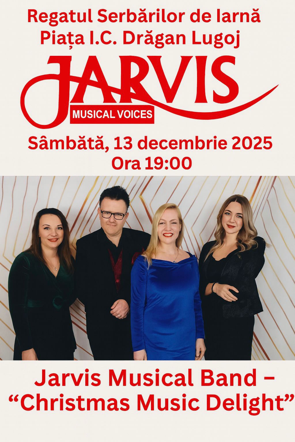 Lugojul se pregătește pentru unul dintre cele mai plăcute momente culturale ale lunii decembrie. Sâmbătă, 13 decembrie 2025, de la ora 19:00, în Piața I.C. Drăgan, publicul este invitat la concertul festiv “Christmas Music Delight”, susținut de grupul vocal Jarvis Musical Voices, în cadrul Regatului Serbărilor de Iarnă. Evenimentul este organizat de Casa de Cultură „Traian Grozăvescu” Lugoj și Primăria Municipiului Lugoj, în tradiția programelor de iarnă dedicate comunității.