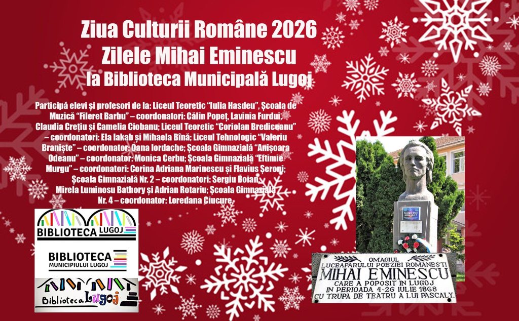 Miercuri, 14 ianuarie, și joi, 15 ianuarie, Biblioteca Municipală Lugoj găzduiește un program dedicat Zilei Culturii Române, construit în jurul operei eminesciene și al implicării directe a elevilor și profesorilor din mai multe unități de învățământ lugojene. Participă elevi și cadre didactice de la Liceul Teoretic „Iulia Hasdeu”, Liceul Teoretic „Coriolan Brediceanu”, Liceul Tehnologic „Valeriu Braniște”, Școala Gimnazială „Anișoara Odeanu”, Școala Gimnazială „Eftimie Murgu”, Școala Gimnazială nr. 2 și Școala Gimnazială nr. 4.