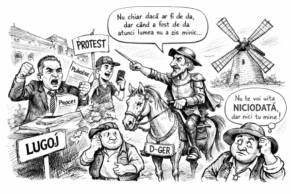 Și parcă lipsea totuși ceva din toată povestea asta, ca să poată primi premiul pentru „Telenovela anului“ ”, la Lugoj. Noroc că a apărut al nostru Don Quijote cu număr de înmatriculare de Germania pe cal, fost și el Mare și Important personaj al Lugojului, care a pus sarea și piperul în subiect. De peste mări și țări, a transmis un mesaj feisbucist plin de înțelepciune către „morile de vânt”, prin care spunea că el „nu” chiar dacă ar fi de „da”, dar, când a fost de „da”, atunci lumea nu a mai zis nimic… Ați priceput, da?